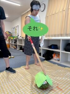職員の「夏と言えば・・・」という声掛けに「海、かき氷、そして・・・スイカ割り!!」と