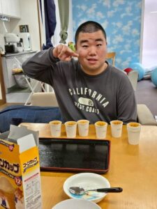 慎重かつ丁寧にコーンカップに注ぎ込みます利用者さんの真剣な眼差し皆さん集中しています