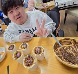 慎重かつ丁寧にコーンカップに注ぎ込みます利用者さんの真剣な眼差し皆さん集中しています