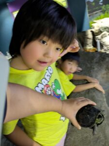 カメと触れ合えるのを楽しみにしていたお友達は、緊張しながらもカメを持ってみたりと