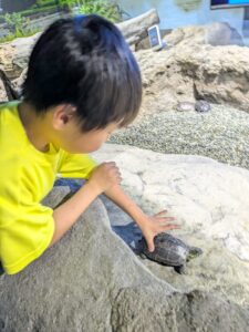 カメと触れ合える体験もしました。少し怖くて、遠慮するお友達もいたけど