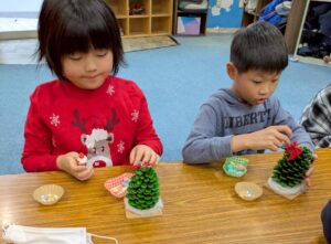 昼食を食べた後、クリスマス製作として大きな松ぼっくりを使ったツリーを作りました🎄