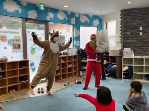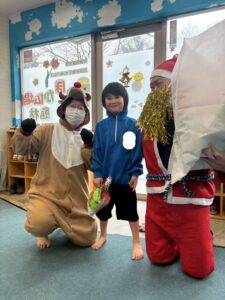 その後絵本の読み聞かせを聞いていると、インターホンが鳴りそこには赤い服を着たサンタさんとトナカイさんが遊びに来てくれました✨
