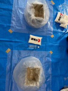 ダイラタンシーは片栗粉と水で作り、ゆっくりさわるとドロドロなのに叩いたり握るなどの力を加えると固くなるなど、不思議な実験遊びに挑戦してみました。ブルーシートに段ボールを置き、片栗粉と水を用意。「ダイラタンシーって何?🤔」「どんなふうになるの?🏸」と今から起こる事に興味津々です😊