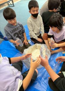 「あれっ、なかなか手が抜けない!😲」「握っても溶けちゃう😃」と、ドロドロした液体が固くなったり溶けてしまう体験を楽しみました😊