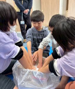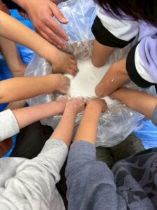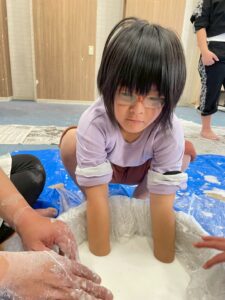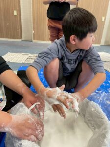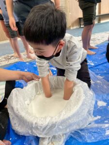 手で触ったり足で踏んでみたり、力を加えて状態が変化する不思議なダイラタンシーの様々な感触遊びを子どもたちみんなが楽しみました😀